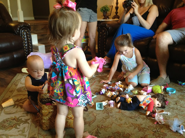 Saturday afternoon really warmed my heart. Not only did I get to spend time with friends that I love and miss but to see all our kids playing together (or at least next to each other!) was so much fun! There were six kids total and I think everyone had fun. There really is something so amazing about seeing your kids playing with your dear friends kids. Maybe it's because we were basically "kids" when we all became friends (sorta...okay we were 19 but we were definitely young and stupid so whatever). Kelsey and I both really enjoyed the weekend and it's made me miss our friends even more!!! Here's a couple pictures to record the chaos: